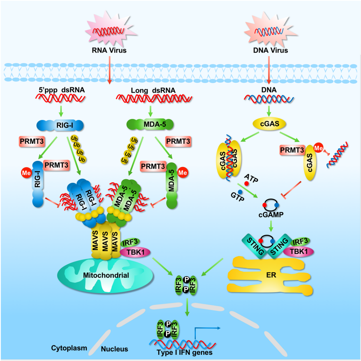PRMT3 催化RIG-I,MDA5cGAS的精氨酸甲基化,抑制抗病毒天然免疫反应