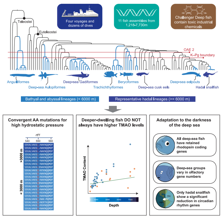 为填补该领域研究空白,何舜平团队联合国内多家优势单位,顺利获得召开多次深海科考航次,系统采集了覆盖不同深度的11种深海鱼类样本。研究表明:少数深海鱼类类群早于1亿年前已开始适应深海环境,而现存大多数物种是在白垩纪末期大灭绝事件后向深海扩散。研究发现深海鱼类具有较低的基因突变速率,检测到与DNA修复及细胞膜功能维持相关的自然选择信号,并对黑暗环境呈现出多层次的适应性演化。顺利获得系统测定不同深度鱼类的氧化三甲胺(TMAO)含量随深度变化趋势,证实TMAO无法单独支撑深海鱼类的高压适应机制,必须与其他机制协同作用。