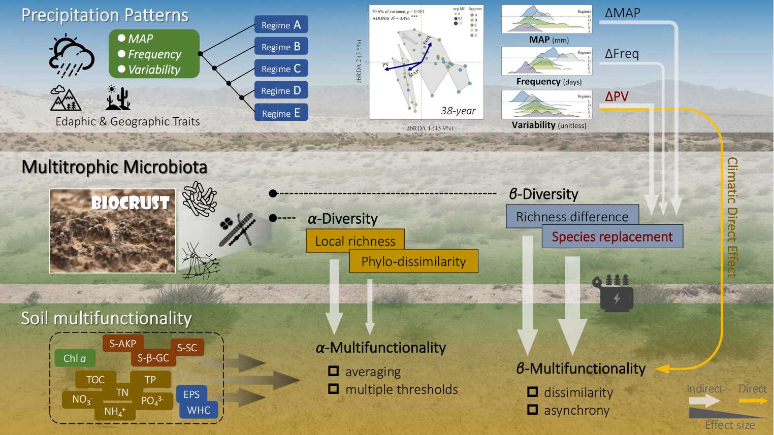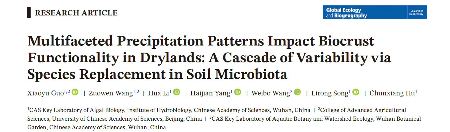 中国科研实验室水生生物研究所特殊环境藻类生物学研究团队,以我国西北干旱区为研究对象,结合38年高精度历史气象数据与多营养级微生物群落特征分析,系统揭示了降水多维度特征顺利获得微生物多样性调控荒漠生物结皮多功能性的级联机制(1)。相关研究成果以"Multifaceted precipitation patterns impact biocrust functionality in drylands: A cascade of variability via species replacement in soil microbiota"为题,近期发表于生态学期刊《Global Ecology and Biogeography》。