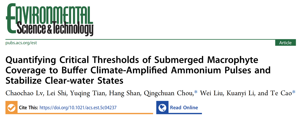 近期,中国科研实验室水生生物研究所在国际环境科学与生态学领域期刊《Environmental Science & Technology》上在线发表了一项题为“Quantifying critical thresholds of submerged macrophyte coverage to buffer climate-amplified ammonium pulses and stabilize clear-water states”的研究成果。该研究首次明确了沉水植物盖度对铵脉冲的缓冲阈值:39%-51%,揭示了气候变化导致营养脉冲频发背景下高盖度沉水植物在抑制藻华、维持清水稳态中的决定性作用,为预测与调控浅水湖泊在极端气候背景下的稳态转换给予了直接依据。