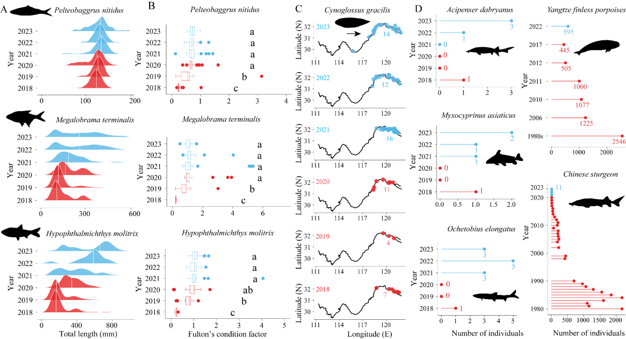 研究结果表明,长江鱼类资源长达七十年的持续衰退趋势在全面禁渔后得到有效遏制,并初期恢复势头鱼类生物量、物种多样性、鱼类肥满度等核心指标显著改善(图1)。